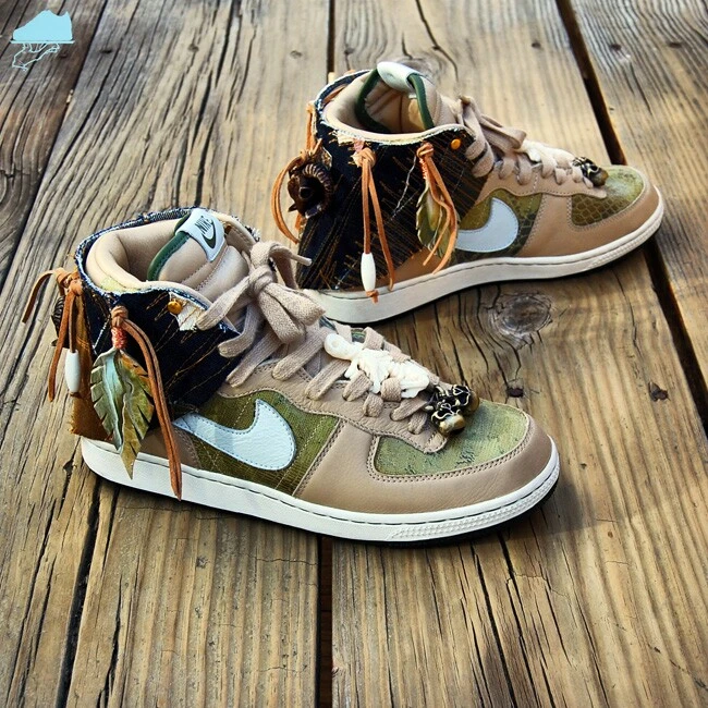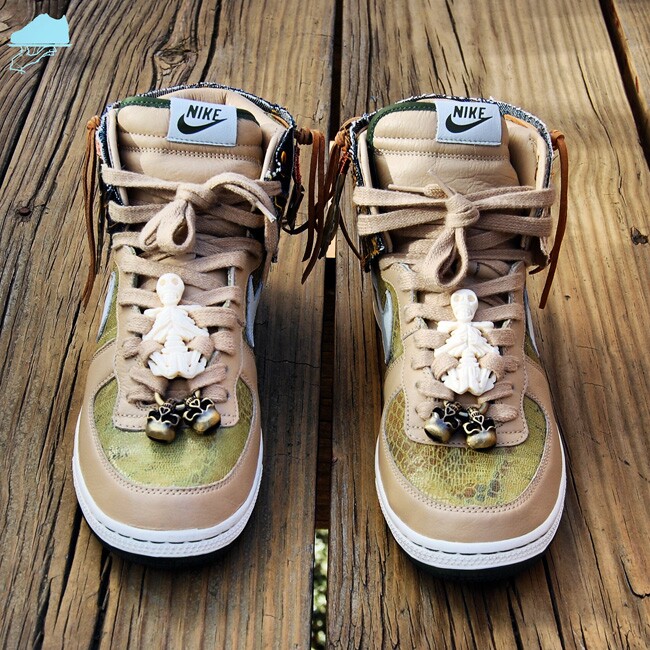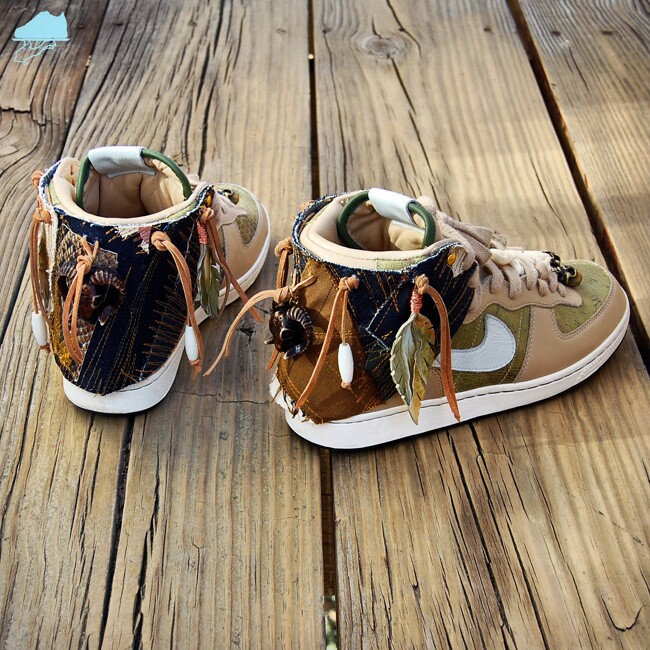 The moccasin flap of the shoe is made from a material known as Kawawaka, named after the artist who created it. The material is a denim base with repairing, distressing, and boro (the Japanese art of repairing and restitching denim) with pieces of canvas, leather, and snakeskin mixed in. The accents used are handmade clay feathers affixed with copper wire, suede lacing, wooden rams skull heel medallion, bone skeleton lacelock and a brass skull lacelock. The final piece is … SAVAGE!