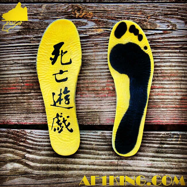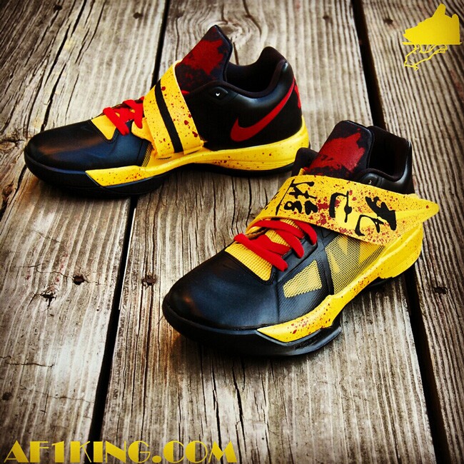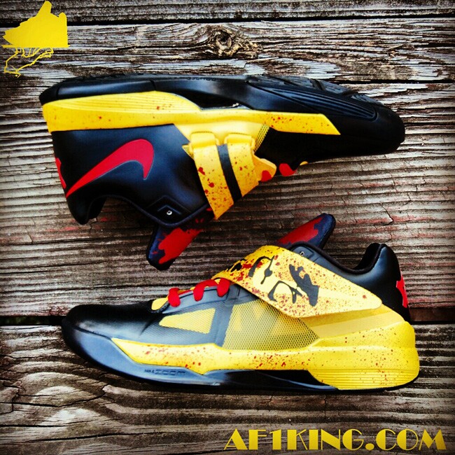 This is the “Game of Death” KD IV custom by yours truly. It is by far one of the most involved KD customs on this website. The theme is Bruce Lee’s “Game of Death” classic Kung-Fu movie. From kanji characters to Kareem Abdul-Jabar’s footprint, from Bruce Lee’s iconic track suit to vicious blood splatter, all the key elements from the movie are represented on this masterpiece.