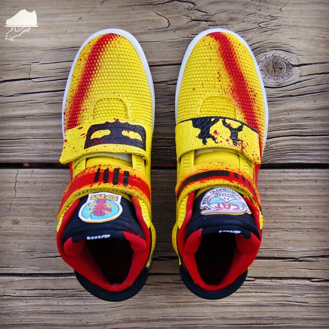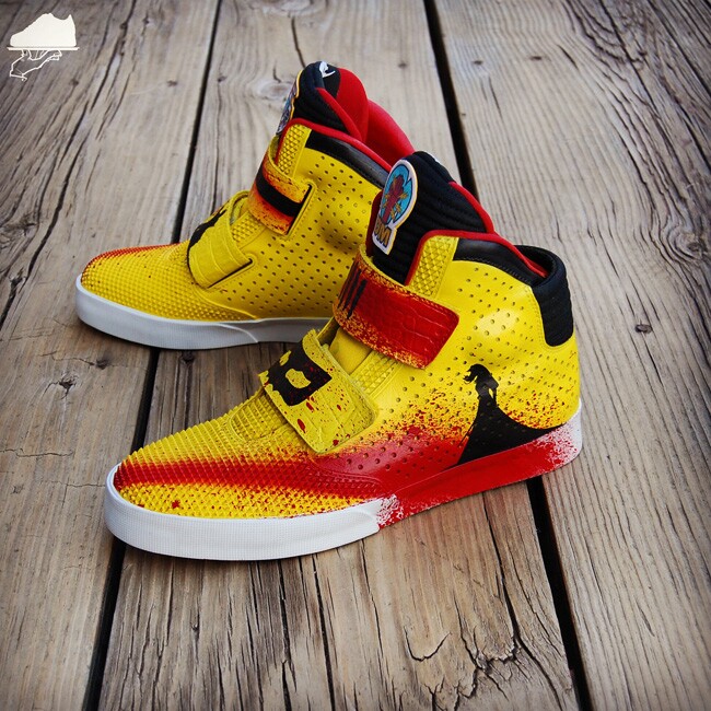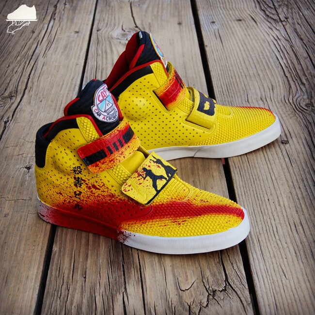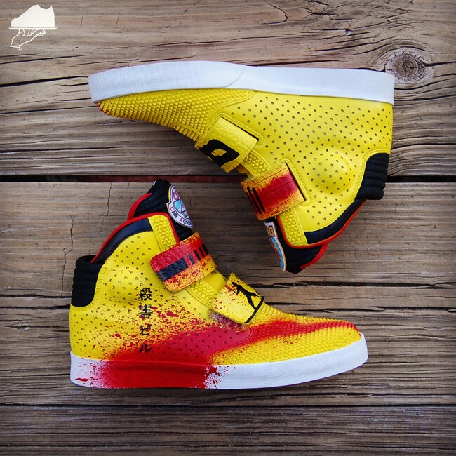 This is a 1 of 1. It will never be recreated. It is one of the best custom Kill Bill kicks ever created by GourmetKickz, surpassed only by the KD4’s that started it all. This pair comes with a custom box, custom insoles, custom hang tags, signature and certificate of authenticity. This pair is a size 10.
