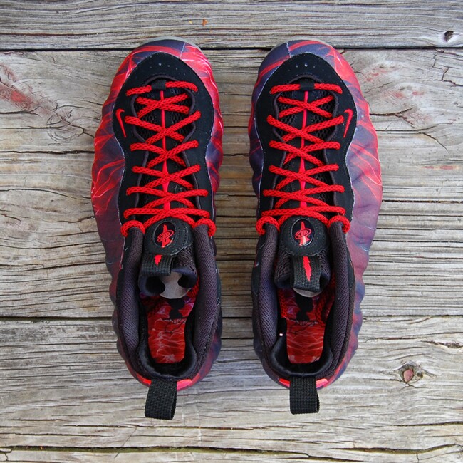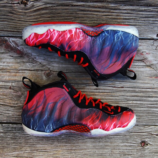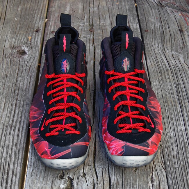 This custom foamposite blends the zombie mist gradient theme seen on the Zombie in South Beach with a gradient background with a new color scheme: black and red. The result is a devilish dish created from an authentic Fighter Jet Foamposite.